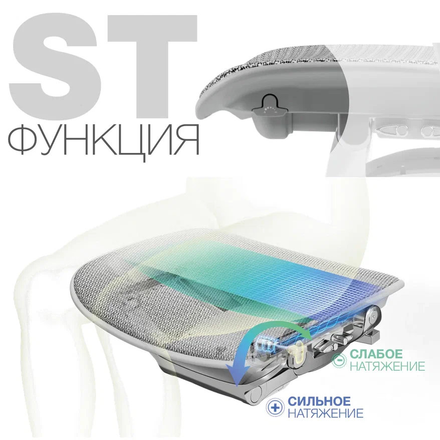 В серии кресел Ergohuman 2 с маркировкой ST добавлена инновационная возможность регулировки натяжения сетки сиденья. Вы можете отрегулировать натяжение в соответствии с индивидуальными параметрами пользователя для максимального удобства.