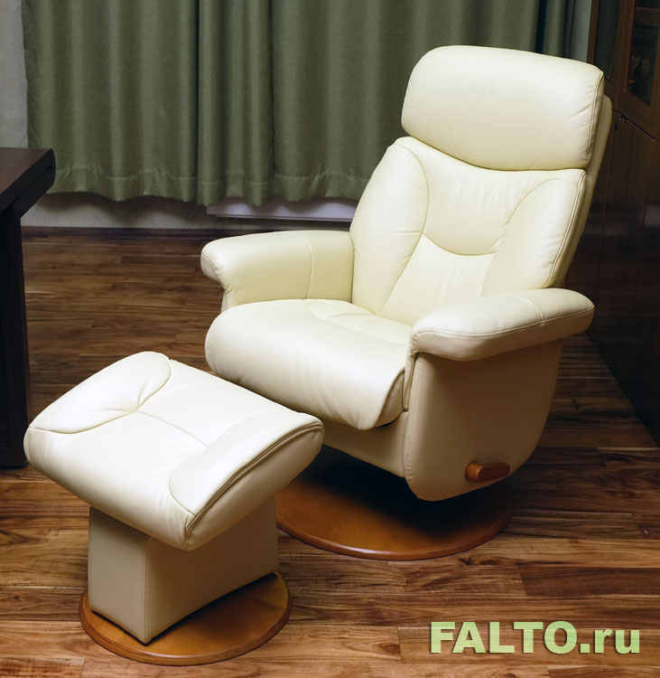 Кресло-реклайнер Falto Hana с подставкой для ногКресло с высокой спинкой, хорошей боковой поддержкой. Внутри пуфика есть место для журналов и пульта от телевизора. Покрытие из натуральной кожи.